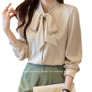 秋の新作女性用白長袖シフォンシャツ、韓国風リボントップス、優しいスタイルのアウターシャツ