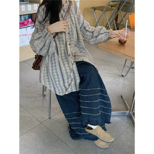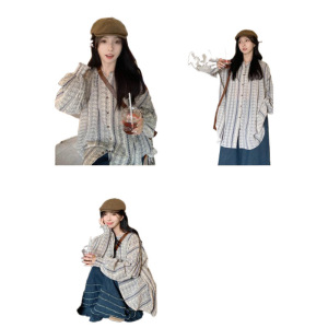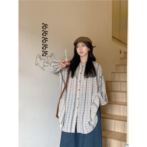 日本系森女早秋レトロ新商品感綿麻模様気品ゆったりシャツ中ロング丈花柄シャツ