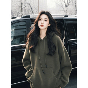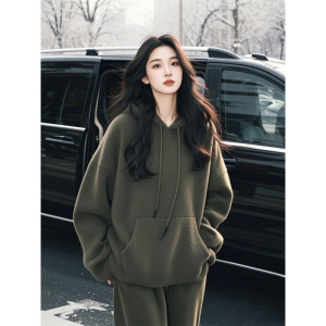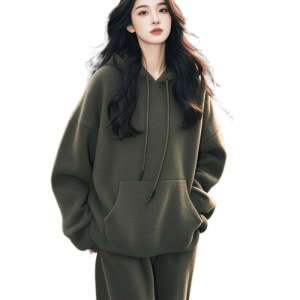 太った特大サイズの秋の冬には、新製品のセットを着て、帽子付きの女性のワイドパンツのセットが湿っています