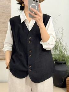 2025春韓国版ゆるい文芸レトロな砂洗亜麻vネック馬甲百合カジュアル袖なし上着女25008