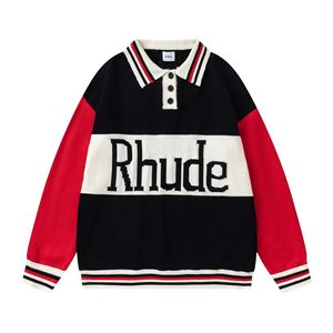 跨境欧美潮牌RHUDE字母提花拼接撞色翻领polo针织衫男女毛衣外套