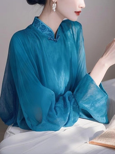 2025春の服の新型のきれいな小さいシャツのフランスの高級感の上着の超美しい気質の青い方襟のシフォンのシャツ