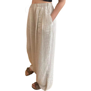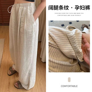 春夏の妊婦の日本の亜麻のストライプの広い足のズボンの薄いタイプの高腰はやせていて、だらだらしています。