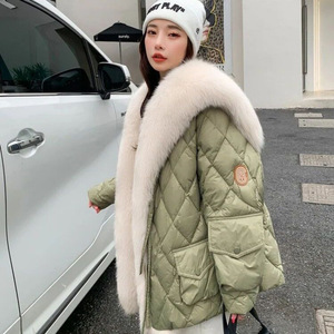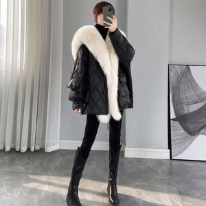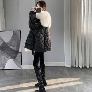 欧米の2025新型海軍の襟の皮はキツネの毛の中の長いタイプの羽毛の綿服のコートの女性の冬の潮をまねます。