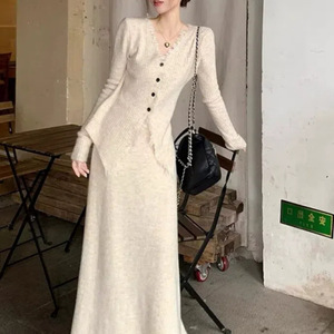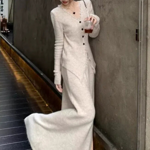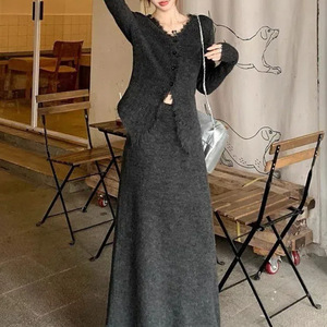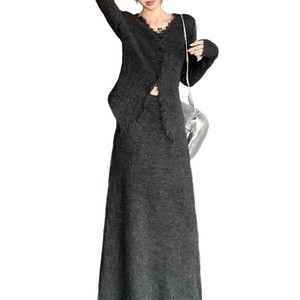 アンドロメダは秋に入って、初冬vネック長袖ニットカーディガンと高腰半身ロングスカートのセットが湿っている
