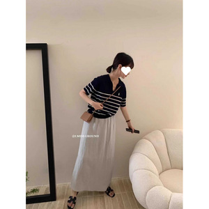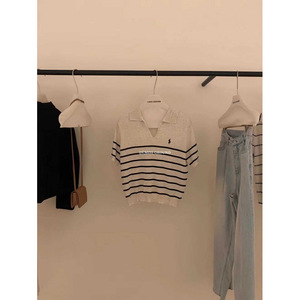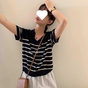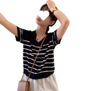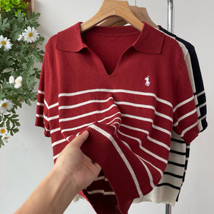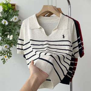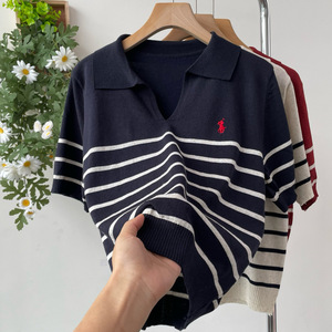 オールドマネースタイルファッショナブルで多用途なストライプVネック半袖刺繍セータートップ女性用新しいショートサマードレス年齢を軽減