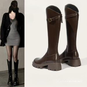 厚い底の騎士の靴の女性の2025新型の秋冬の茶色はやせています。