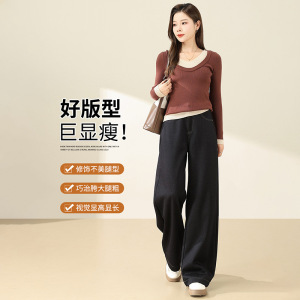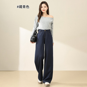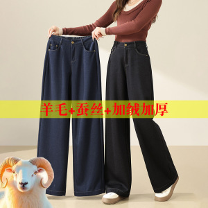 メーカー直販【ウールシルクジーンズ】裏起毛厚手カジュアルパンツ レディース ハイウエストストレッチ保温ワイドパンツ
