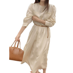 韩国女装高货东大门小清新圆领收腰连衣裙长裙 韩版chic 时尚