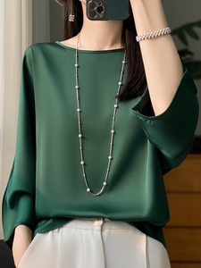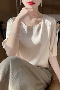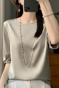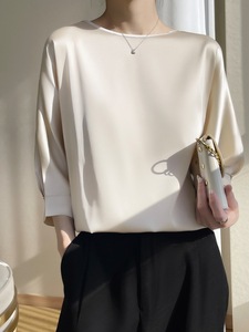 デパートの同じ半袖tシャツの女性夏2025の新型の肩の高級感の酢酸のサテンの百合の質感の底のシャツ