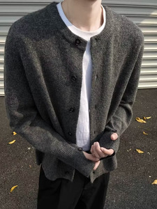 米の白い丸首のカーディガンのセーターの男性の冬の怠惰な香りのメリヤスのニットの短いタイプのアメリカ式のcleanfitのコート