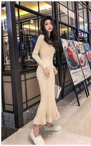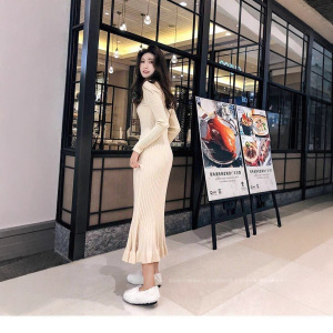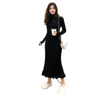 春の優雅な気質は身を修めて膝の中の長いタイプの底のセーターを打ってヒップのスカートの毛糸の魚尾のニットのワンピースの女性を包みます。
