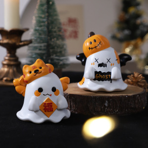 かわいい幽霊がクリエイティブな家庭のデスクトップに装飾品を飾っているなら、ハロウィーンアニメは人形のプレゼントを責める