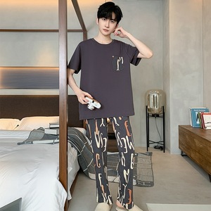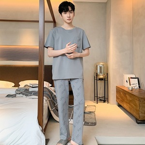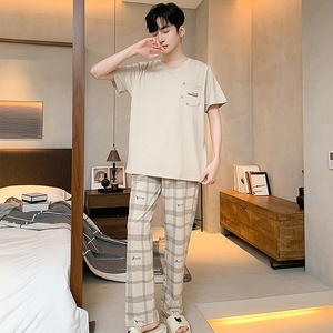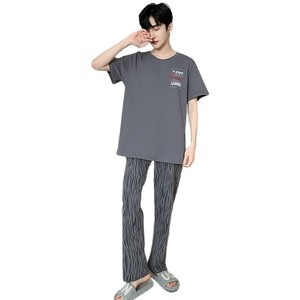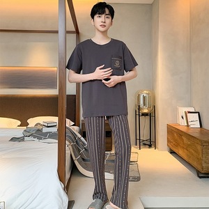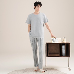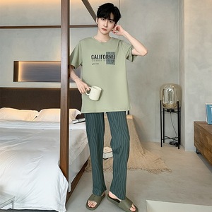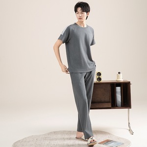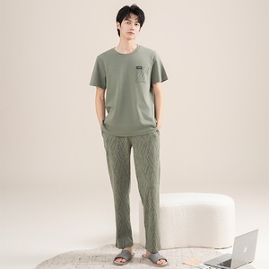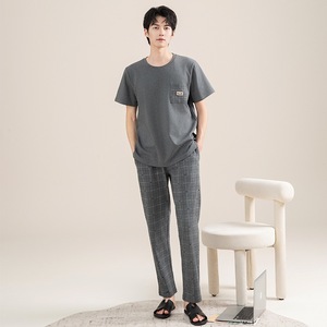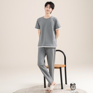 日系カジュアル純綿パジャマ男性夏半袖長ズボンセット男性はシンプルな純色家庭服セットを着ることができる