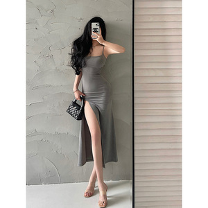 Pure Desire Hot Girl レースステッチバックレスヒップスカートセレブ気質ハイスリットグレーサスペンダードレスロングスカート