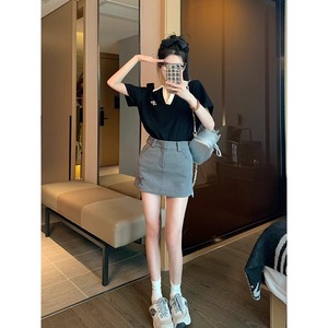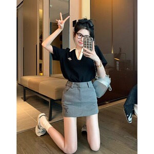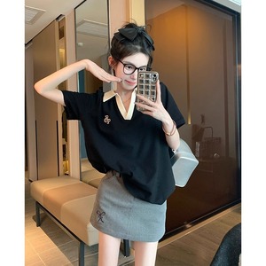 官図200グラム半袖tシャツ夏2025刺繍衝突色修身正肩ショート襟上着女装