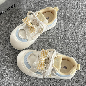 蝶結びのオリジナルの小衆の皮のピンクの板の靴の女性の2025新型の百合の春のパンの靴の厚い底の小さい白い靴
