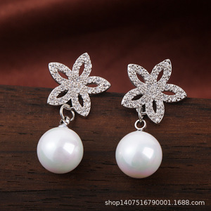 32-Xiaoxiangfeng マイクロ舗装ジルコン パール スタッド ピアス-シルバー