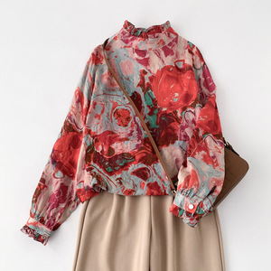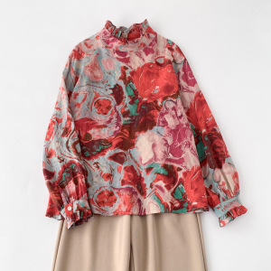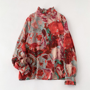 実写2025春夏の新型女性ロマンチックで清新な花の縁の襟の上着の女性の綿麻の長袖のプリントのシャツ