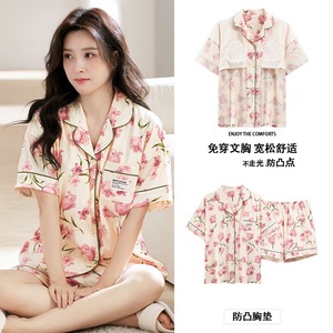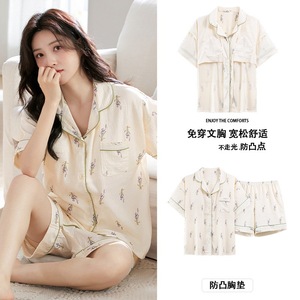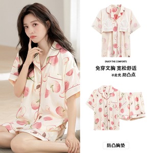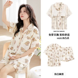 雲の綿の半袖のパジャマの女性は胸のパッドの夏のカーディガンを持って襟のゆったりしている大きいサイズをひっくり返して部屋の服のスーツを着ることができます。