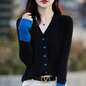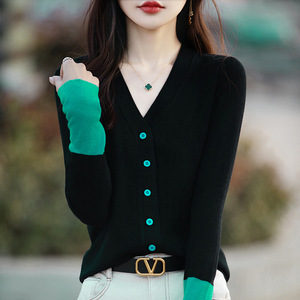 2025春秋の新型vネックの色のメリヤスのカーディガンの女性はつなぎ合わせて外にゆったりしています。