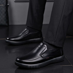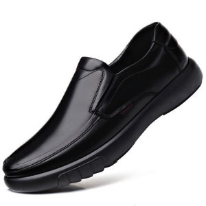 春の新型革靴2025通気性ビジネスカジュアル男性靴ソフト底pu皮平底中老年お父さん靴黒