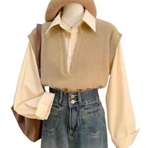 2025春の新型韓国版のゆるいpolo襟の偽の2つのつなぎ合わせのシャツの女性の長袖の短い上着のファッション
