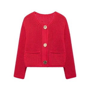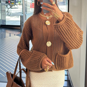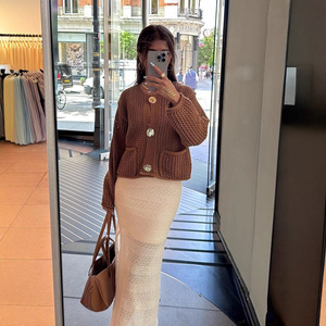 2025クロスボーダー女装純色単列メリヤスカーディガン女性ダブルポケット丸首長袖粗針セーターコート女性
