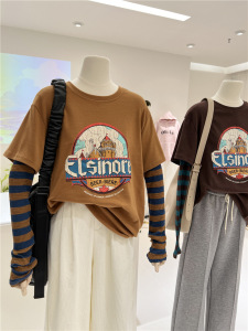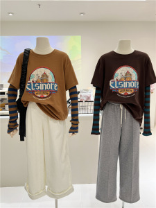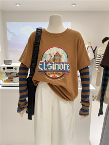 复古印花春秋韩国百搭磨毛棉拼接条纹假两件长袖t恤女打底衫上衣