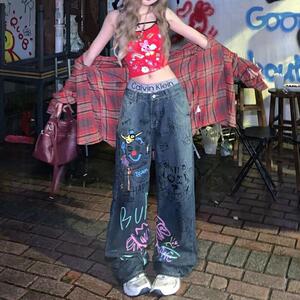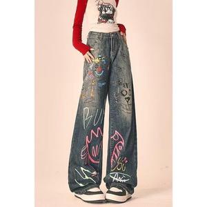アメリカの落書きプリントのストレートジーンズの女性の春の新型の高い街のデザイン感がゆったりしています。