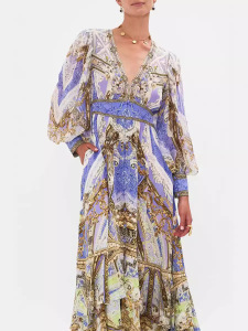 夏オーストラリア小衆潮牌CMLレトロ女神抽象プリントvネックシルクリゾートワンピース