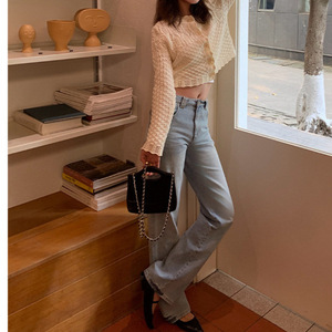 韓国系のデザイン感がレトロな透かし編みのカーディガン