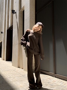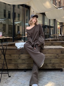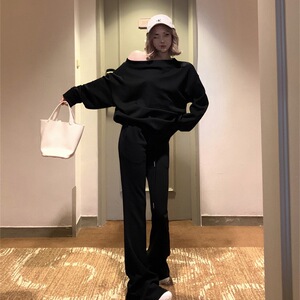 春秋穿搭美式卫衣女chic韩系休闲百搭慵懒风宽松长袖斜肩露肩上衣