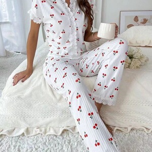 国境を越えた欧米風の女性パジャマ秋冬のセクシーなvネックレースのさくらんぼプリントtシャツのスリムなズボンの部屋服