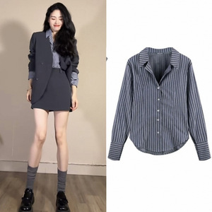 秋にはvネックの長袖スーツのジャケットの中にストライプのシャツの半身のスカートを着ます。