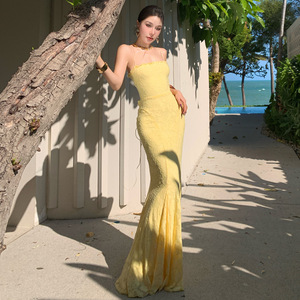 現物2025春夏の新型高品質優雅なウエストドレスのストラップワンピースのリゾート風の雰囲気感