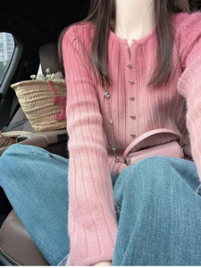 ピンクの高級感のあるニットセーターの女性の初春2025の新型の韓国系chi独特のシックなデザイン感の上着