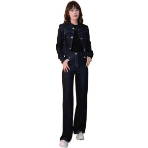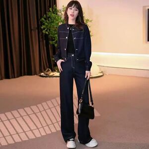 ファッションのデニムのスーツの女性の2025春の新型の洋気の年齢を減らす気質はやせているショートコートのワイドパンツの2つのセットを現します。