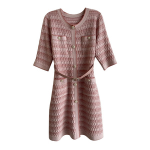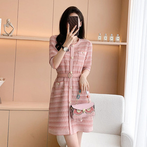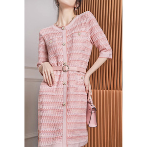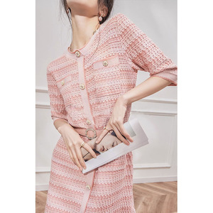 7383小香風ワンピースフランス高級感名媛軽熟風気質ピンクニットスカート単列ボタン