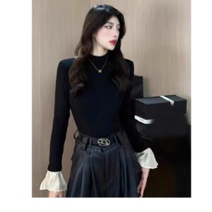 インナーシャツ女性2025春秋モデル黒長袖tシャツデザイン感ラッパ袖ハスの葉の周りの修身上着