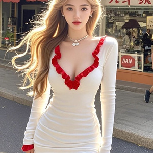 デザイン感紅白衝突色低襟長袖ワンピース女性秋2024腰包尻ギャル風純欲スカート