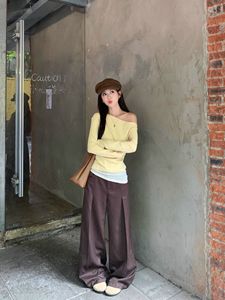 【自社工場現物】レースの黄色の斜め肩の底のシャツの女性の早秋の肩の甘いギャルの短い上着