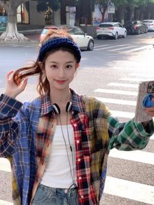 アメリカのレトロな長袖の格子のシャツのコートの女性の夏の日焼け止めのシャツのゆったりとした衝突色のカーディガンの中の長い上着