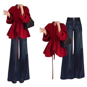 小さい人のデザイン感の小さい人のスーツの女性の春秋の新型の年齢を減らして肉の赤いオーバーのジーパンの2セットを隠します。