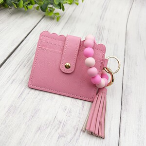 人気シリコンビーズブレスレットカードホルダー、無地シリコンビーズブレスレット、PUタッセル付きレディースレザーウォレット、IDホルダー