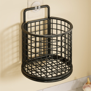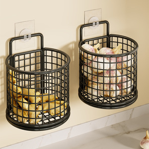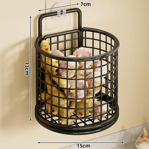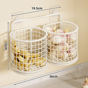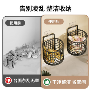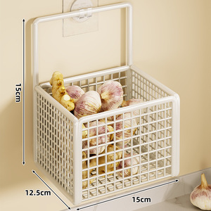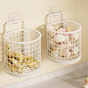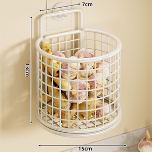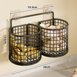 台所の物置棚のネギとニンニクの収納箱の調味料の収納かごは穴を開けないで壁の多機能の壁掛け式の収納かごです。