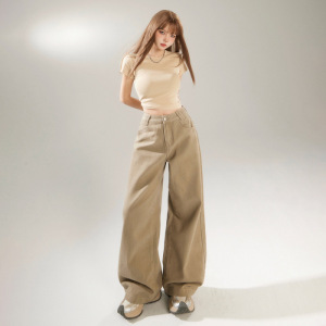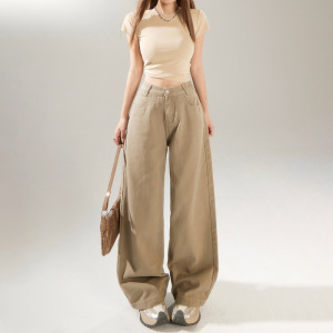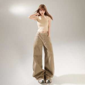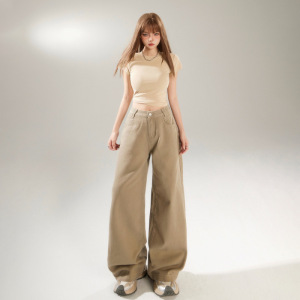 アメリカのロングウエストのゆったりとしたワイドパンツと春夏のレトロなカーキ色のストレートジーンズの女性が国境を越えている