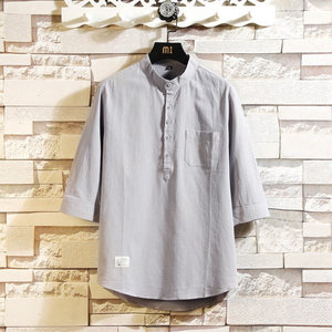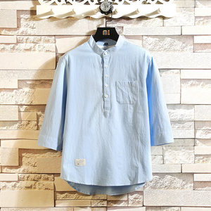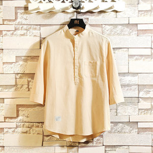 立襟tシャツ男性半袖夏の薄いファッションブランドの氷糸綿麻T七分袖シャツ服中国風純綿シャツ