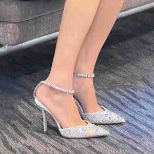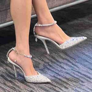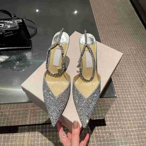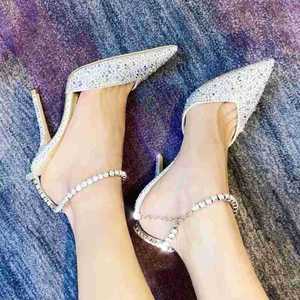 一字のドリル付きサンダル2025夏の新型チェーンの先のハイヒールの女性の細いかかとの明るい口の水晶の靴