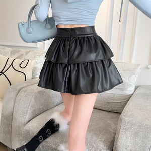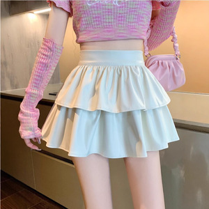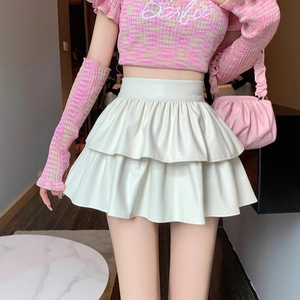 ケーキの蓬蓬のスカートの高腰のしわはやせているpu皮のスカートの白い半身のスカートの2025の新型の夏の光のa字のスカートを防ぎます。